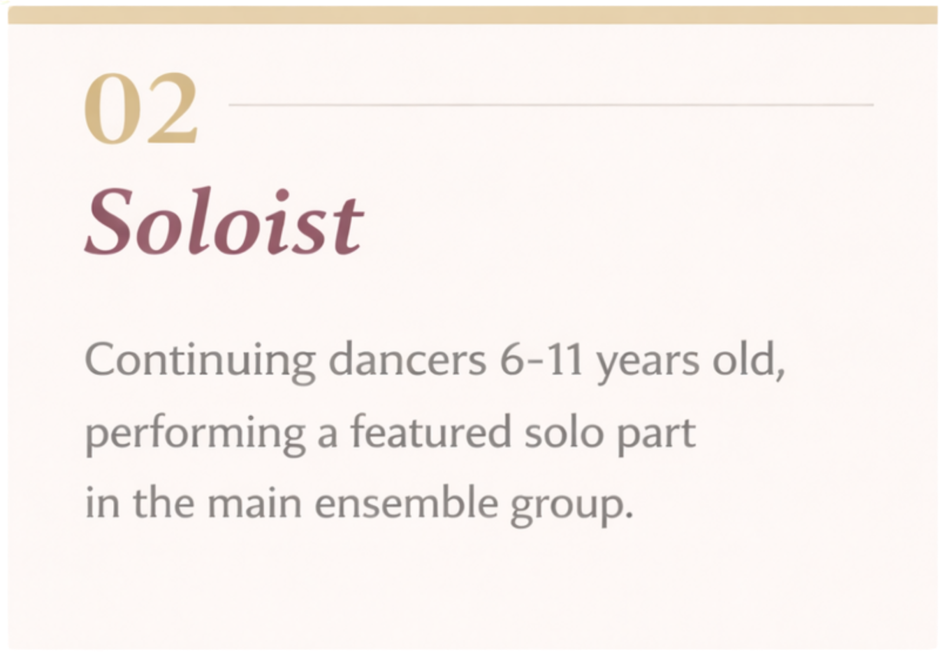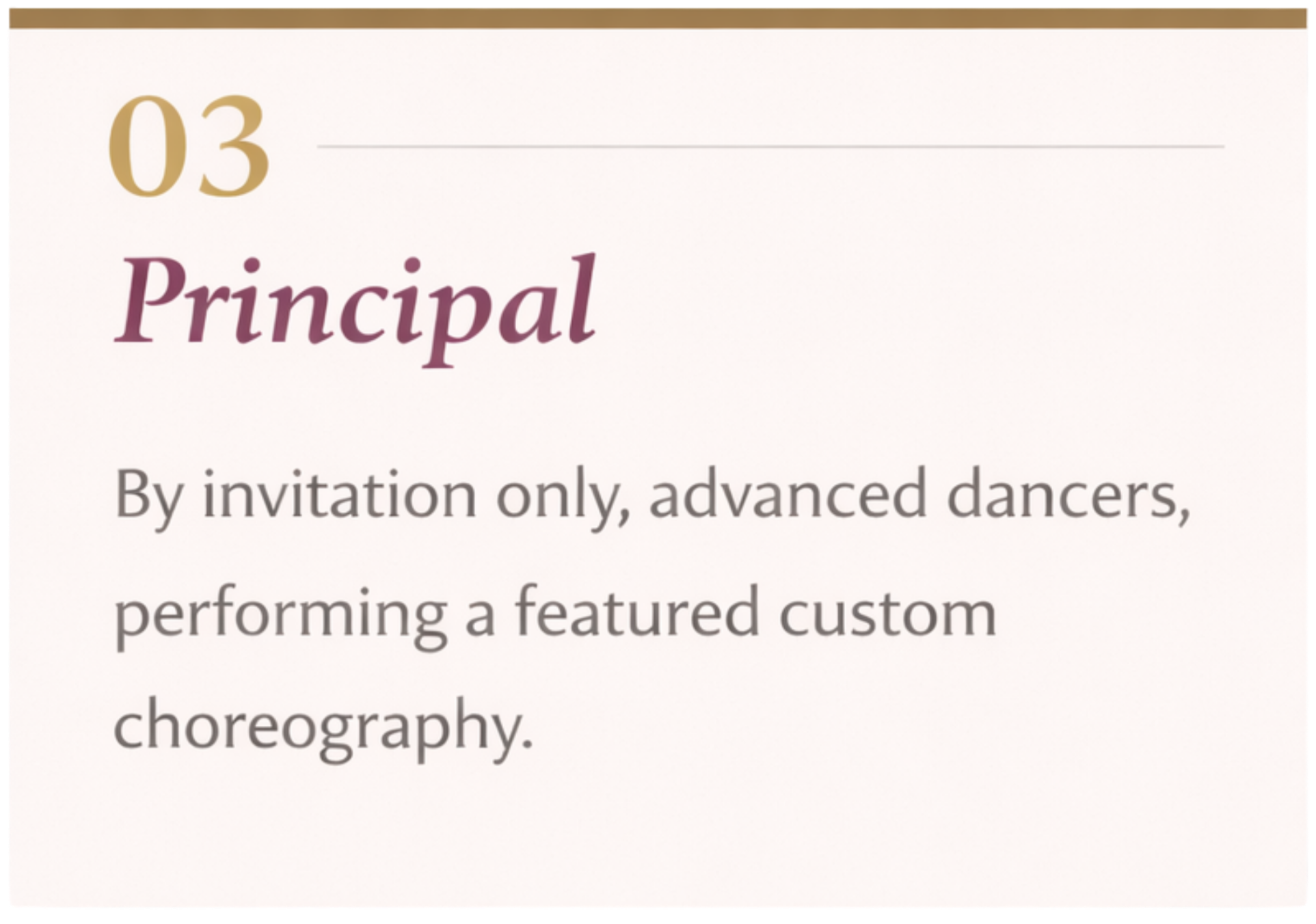 Soloist and Principal tiers are for continuing dancers who have been attending Ensemble group classes. Teacher observes each student throughout the year and issues promotions based on readiness. A Soloist promotion typically occurs after one to two semesters. Principal is by invitation only.